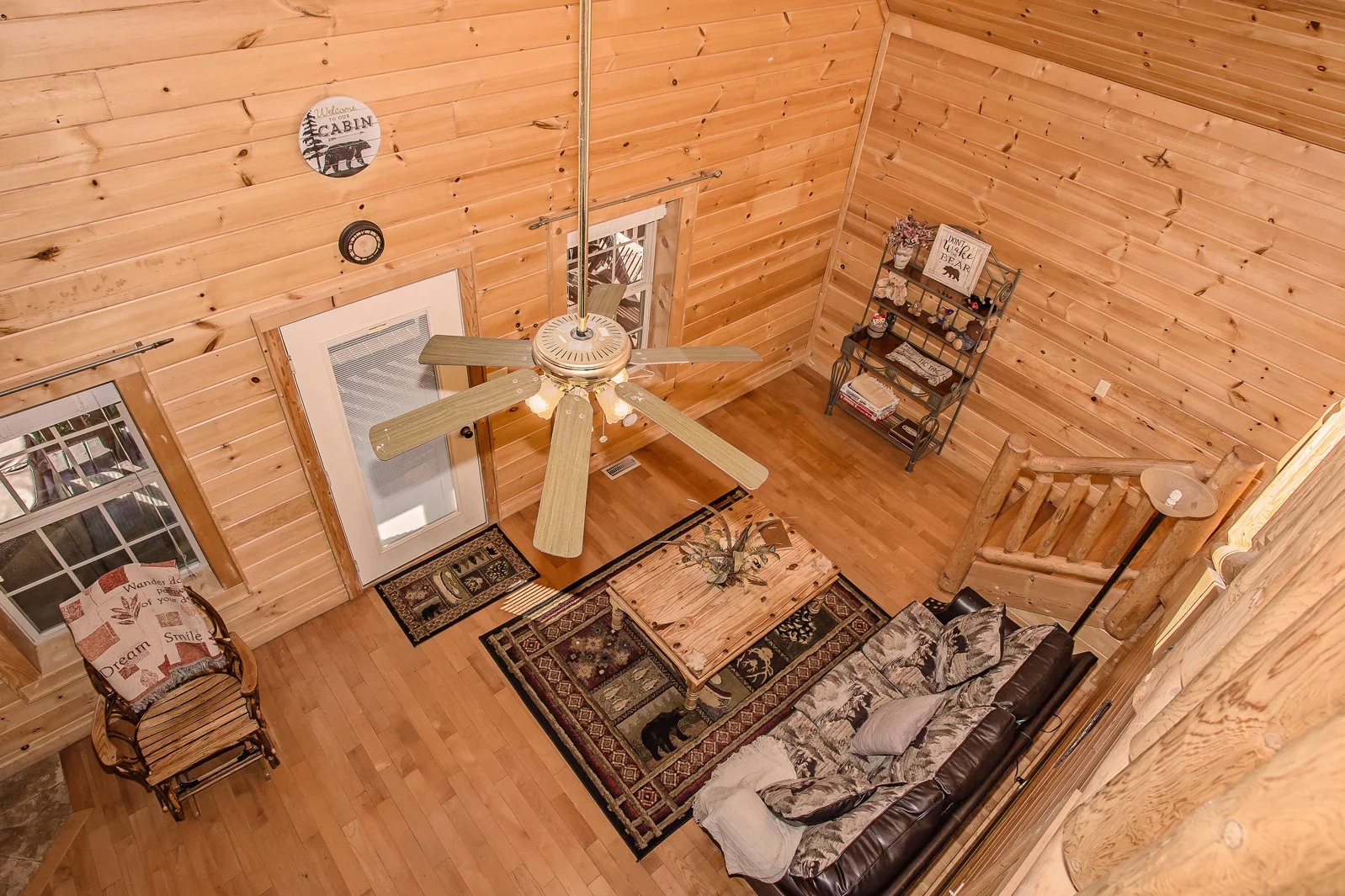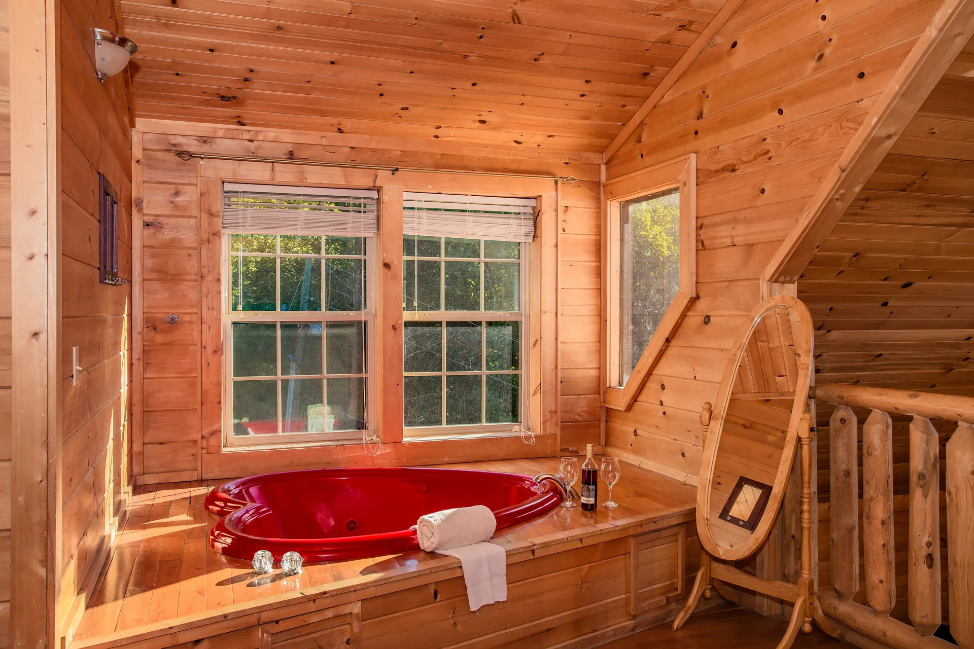 Relax in the family room on the comfortable sofa and glider rocking chair in front of the cozy gas fireplace and enjoy your favorite program on the new 55" Smart TV. Upstairs is an open loft with a large king-size bed and a romantic heart-shaped Jacuzzi. Additional luxuries include a 43" smart TV and a full bath with an electric hairdryer.