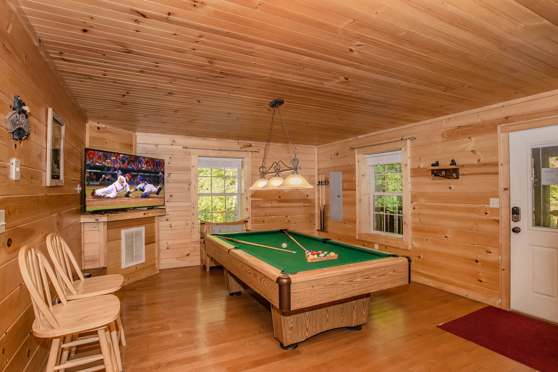 Downstairs you can thoroughly enjoy the experience of your own private heated swimming pool year-round. The Sauna, off the pool room, provides you with ultimate relaxation as well as the two rocking chairs on the exterior deck. While relaxing you can also shower in a full-size bath. Discover the ultimate experience in luxury when you stay with us. We are a small family business owning several cabins in the area.
